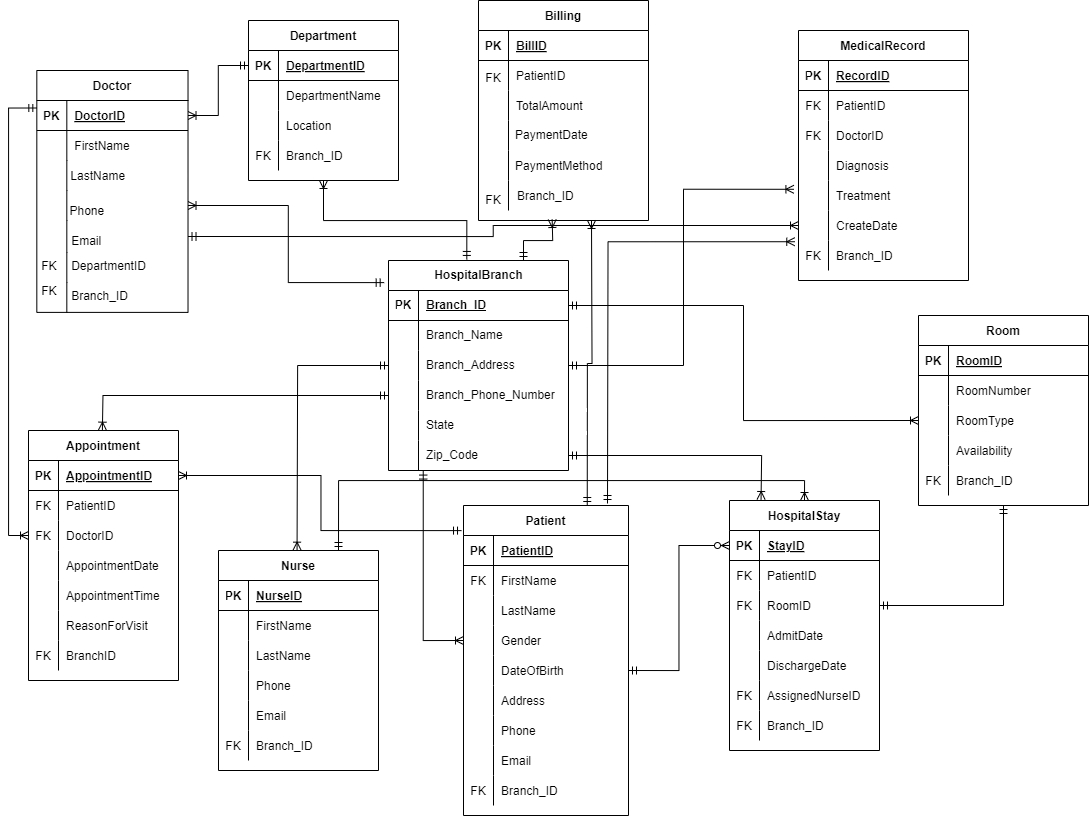 Hospital management database designed to organize patient records, staff information, appointments, medical records, room allocation, and billing. The system improves operational efficiency and centralizes healthcare data management.
