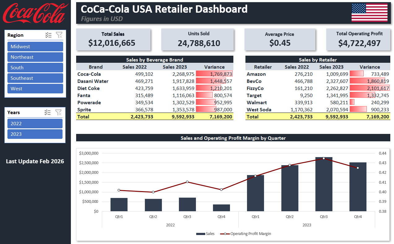 Excel analytics dashboard analyzing Coca-Cola retailer sales performance across regions.