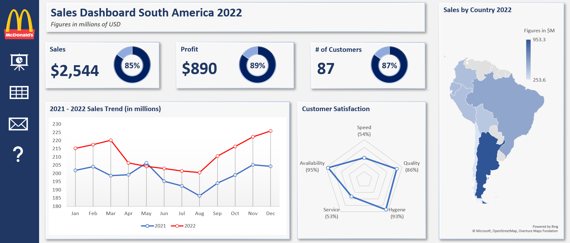 Excel dashboard visualizing sales performance across McDonald's locations in South America.