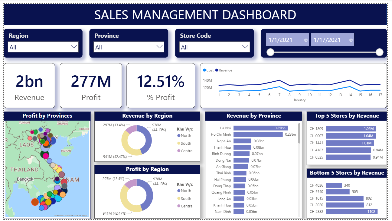 Interactive dashboard tracking revenue, product performance, and sales KPIs.