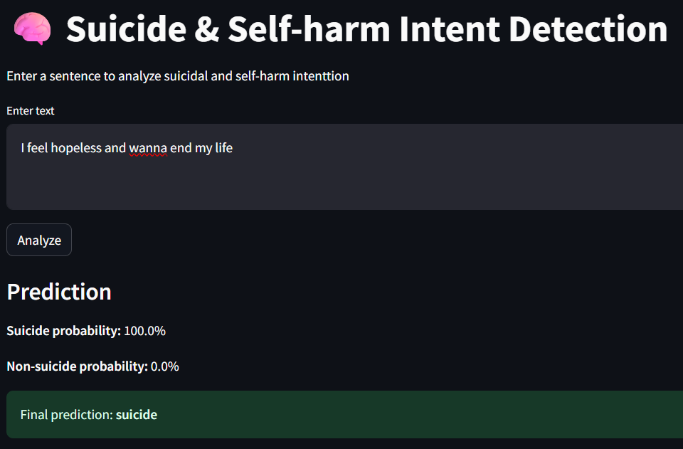 Natural language processing model identifying suicidal intent and mental health risk signals in online text data.