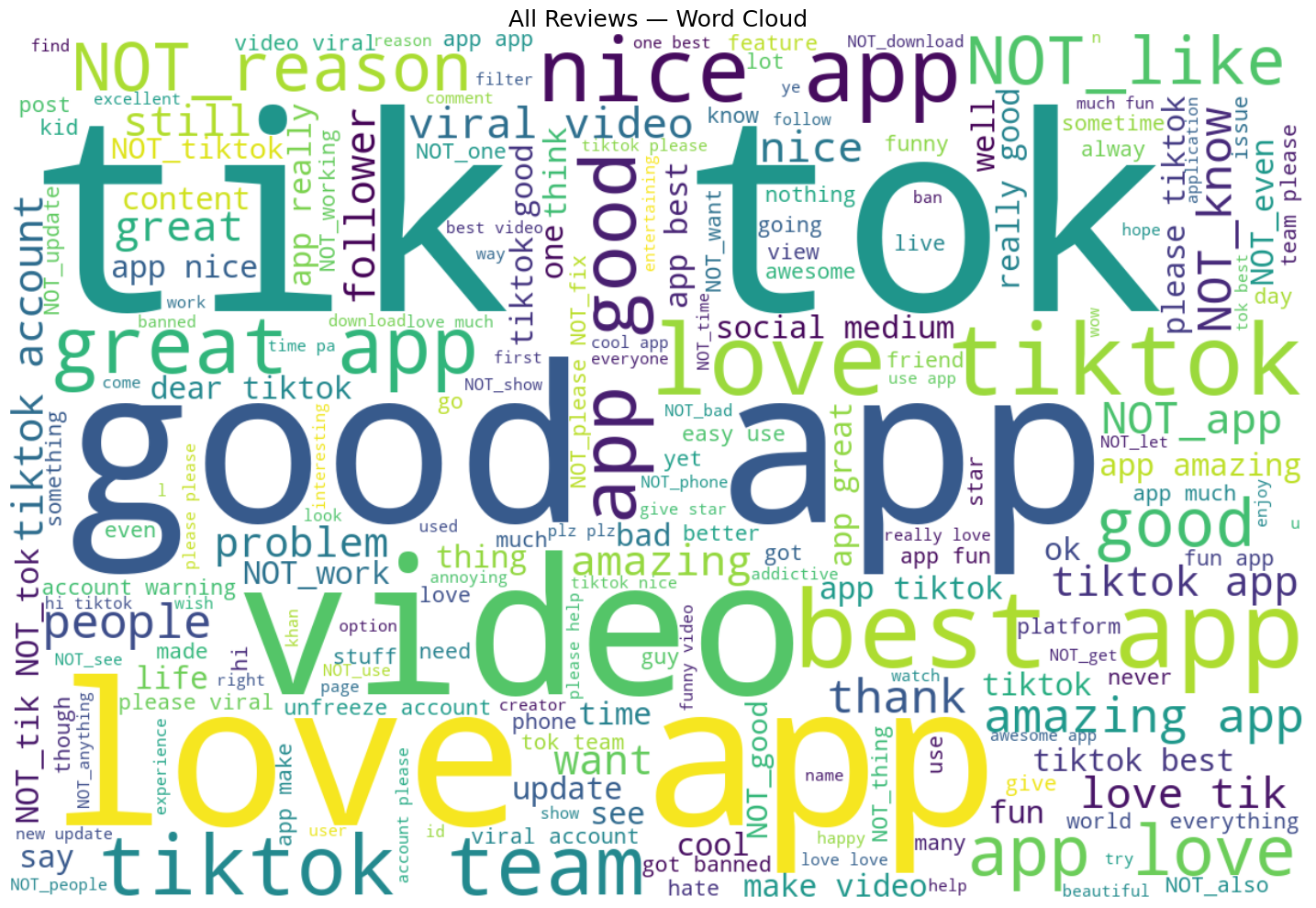 Sentiment analysis pipeline analyzing TikTok mobile app reviews to uncover user satisfaction trends.
