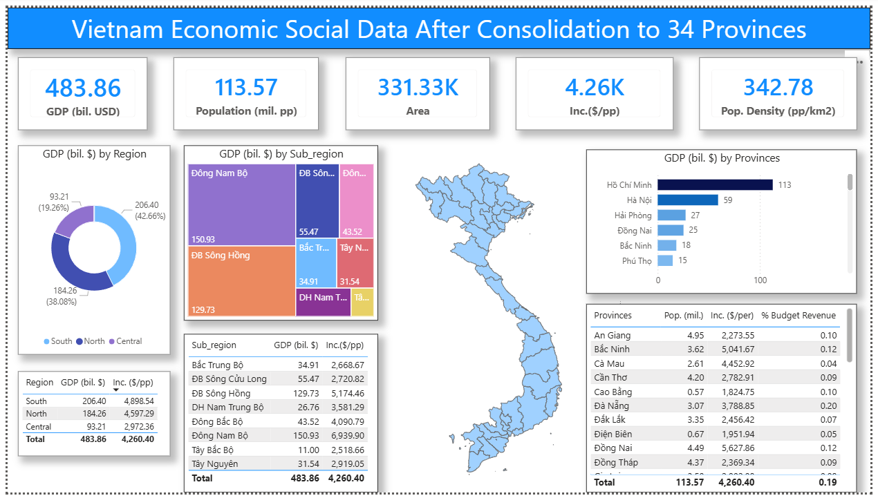 Power BI dashboard visualizing socio-economic indicators after administrative restructuring into 34 provinces.
